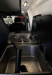 • Tavolo per interno rimovibile, con gamba pieghevole • Supporto magnetico per installazione tavolo all'esterno • Piano cottura combinato Dometic 2 fuochi + Lavello • Frigo a compressore Vitrifrigo C39 Lt– 40 Lt